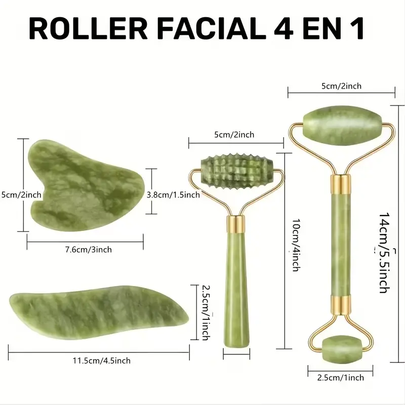 Coffret contenant un ensemble de 4 rouleaux faciaux & Gua Sha, Masseur facial avec outil de grattage Gua Sha, Masseur en pierre de jade.